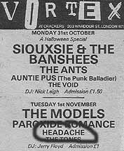 Headache also played the usual punk palaces like the ‘Roxy’ and ‘Vortex’ in London’s’ Soho district all through ’77, playing with bands such as, Raped, Bethnal, Merger, Mean Streets, and err Crocodile.