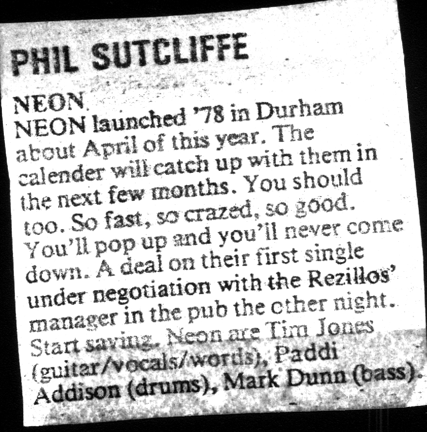 Neon formed in early 1978 and were from County Durham and they really did sound like no other band at that time. Originally coming from the remains of a band called The Hephalumps they weren’t going to be your bog standard 1234 merchants. However as Tim Jones recalls “We were immediately labelled punk from our first gig so that’s what we thought we were although in retrospect there were so many other influences that eventually became known as New Wave.” He accurately describes their sound as “progressive punk…. Fast and furious guitar riffs.” I’ll add weird time signatures verging on jazz to that! Live their “playing jerks with danceable tension” opined Phil Sutcliffe in Sounds to complete the description of their sound.