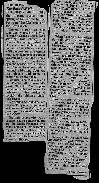 …the Boys have come too far, too fast to have done it all without a touch of voodoo. When they first started most everybody saw them as a joke. I mean they weren’t deep punk were they? Too sweet by half. They didn’t look like they could threaten a dodo, let alone Rod Stewart. So what if they they sounded good and seemed to have fistfuls of excellent songs?