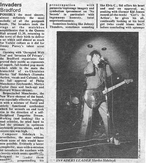 The Invaders, from Bradford Yorkshire, and led by ‘Sid’ Slavko Sidelnyk, were typical of the more poppy keyboard-inflected new wave sound that was just one of the many strands that punk rock had mutated into.