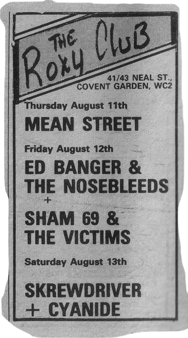 Ed Banger I think we had moved ahead of them until they landed the support slot with the Pistols and we ended up being their roadies for the night just to be part of it. So after that gig we decided to have a stronger name after I’d been bottled on the head side stage and someone had punched Pete giving him a nosebleed so we came up with Ed Banger and the Nosebleeds. Johnny Rotten being a concerned citizen said I’d better get some stitches in that and Jonesy said bollocks to that have another beer. Cool. Punk77 Interview