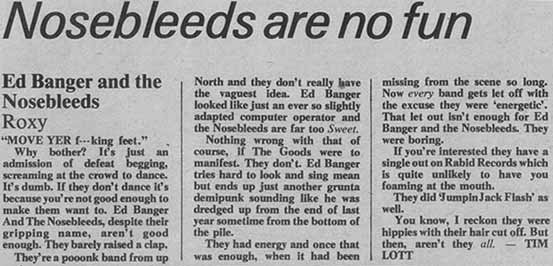 Following the Pistols visit and the emergent punk rock scene Wild Ram became Ed Banger & The Nosebleeds who, like so many other bands, changed and adopted a more punk look and sound. As Wild Ram they had been unable to get gigs or played to 15 people. Now as a punk band “We ….had a single out, it was like 400 people at a concert.”