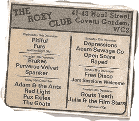 That would have been about November 77’.The band were having a bit of a problem. The singer Tony Cunningham, lost his nerve, he just couldn’t sing in front of an audience which is fundamentally quite important being the front man! The band had their very first gig at the Roxy on MONDAY the 16th of DECEMBER, that was the ROXY audition night, and just 50p to get in.