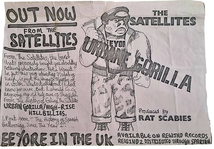Our first single Urbane Guerilla was produced by Rat Scabies. The Satellite’s supported his band, the White Cats which was his band after The Damned. He just said straight away he’d like to produce us and we held him to that. He also did a couple of gigs with us on drums and occasionally on 2nd guitar; again, it was at the White Hart pub in Acton.