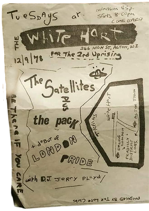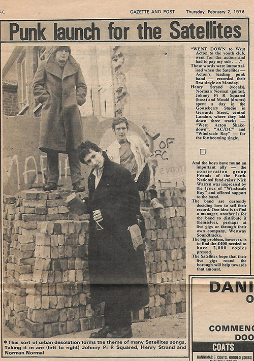 The Satellites were an Acton (London) band and featured Derek Gibbs (aka Dr Strangelgove ) on vocals. Derek was a well-known Acton punk who had appeared in the local press a few times courtesy of journalist friend Carol Clerk (who would later go on to write for the Melody Maker), had his own fanzine Sound Of The Westway (the Westway is a London dual carriageway that intersects Acton and North Acton) and wrote for the poster zine New Wave News, a short-lived punk club night. He’d also appeared on the cover of the popular budget Phonogram punk compilation New Wave in late 1977.