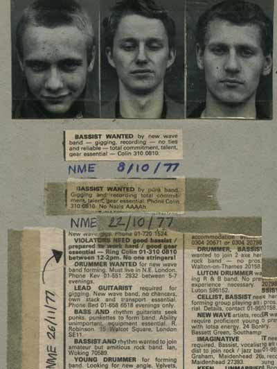 Right: The time honoured tradition of advertising in the music paper for musicians wanted. As you can see it was a busy time for Punk/New Wave bands forming!