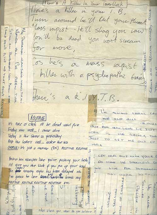The vocals were naive and carried out with more than a hint of Lydon about them. We never went in for groundbreaking lyrics, you can tell from this snippet of ‘Suicide.’ Click on lyric image right for larger image.