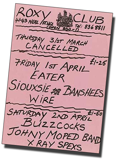 In 1977, like most bands, we sent a tape to the Roxy Club to see if we could get a gig. On 23/4/77 we supported Siouxsie And The Banshees at the Roxy on the same night as they were filmed for Don Letts’ Punk Rock Movie. Two months later we played there as the headline band. There was no support band so we supported ourselves. I can remember there were about 10 people there. It was midweek, the gig was not advertised and it was during the (sad) decline days of the Roxy.