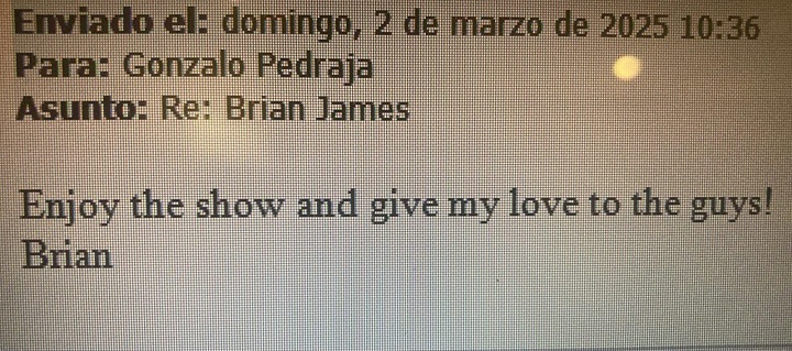 On Saturday, March 1st, I received the email with his answers, and after reading them two or three times, I responded, thanking him for the gesture and telling him that on Monday the 17th, The Damned would be playing in our country and I’d be lucky enough to see them. The next day, I received another email: “Enjoy the show and give my love to the guys!” Brian.